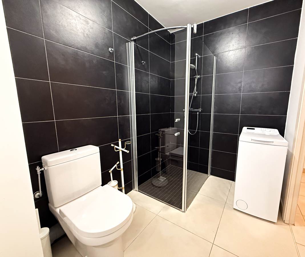 El espacioso dormitorio cuenta con una cama doble grande y un práctico espacio de almacenamiento, lo que garantiza noches de descanso reparador. El apartamento también incluye un elegante baño con ducha y un aseo independiente para mayor comodidad.